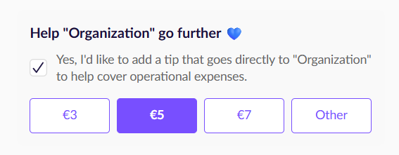 Once you enable one of the options, it will appear on the checkout page and will be automatically marked, Your supporters can opt to uncheck it or change the suggested amount in the "Add a Tip" option.